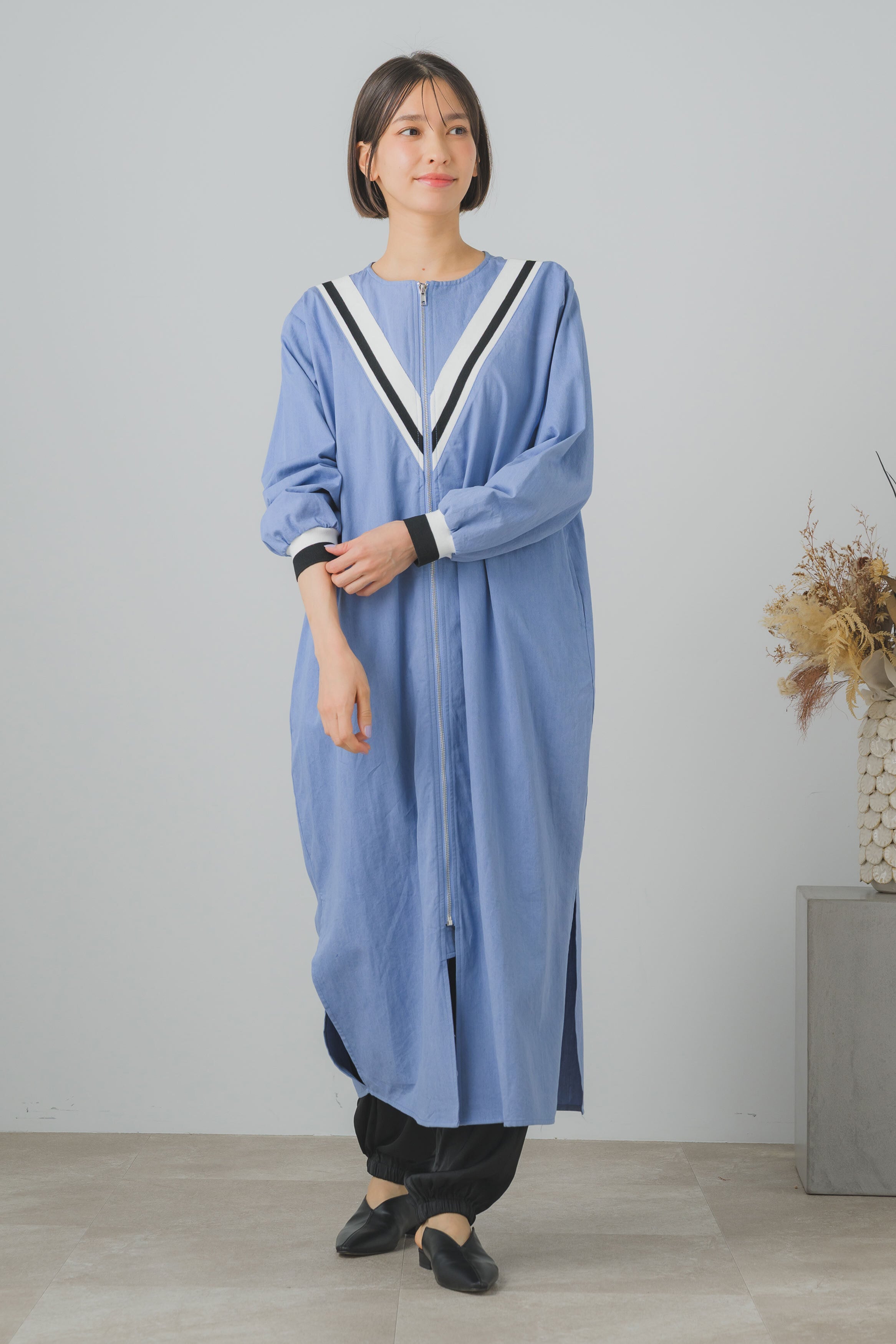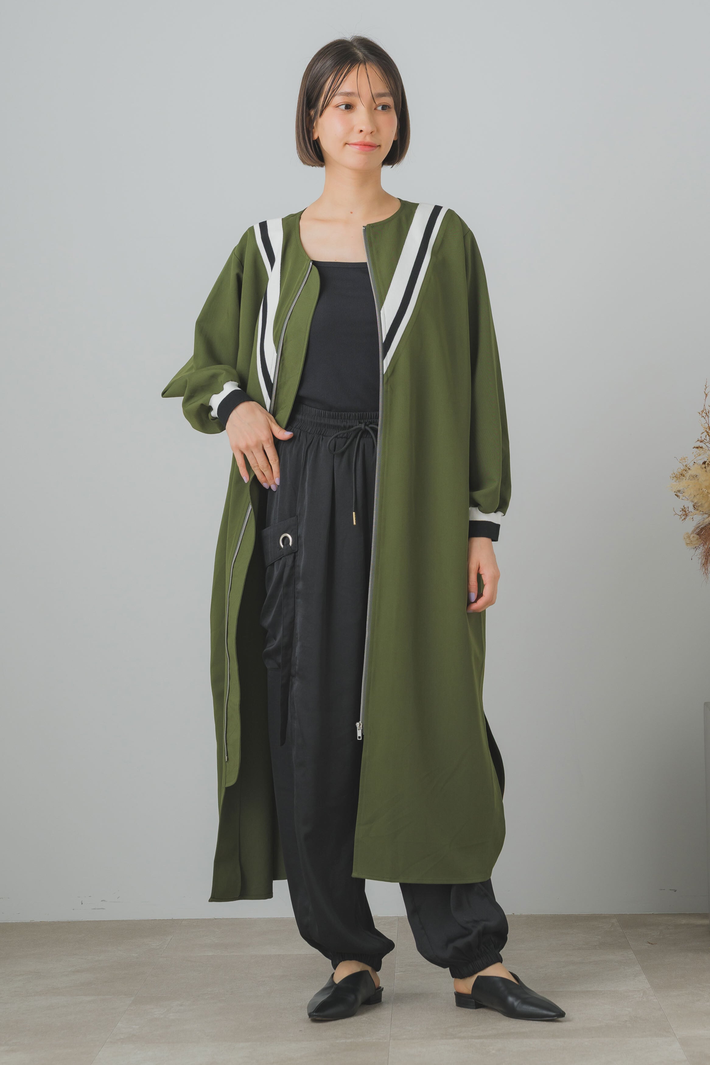 一目で印象的なロングブルゾン。