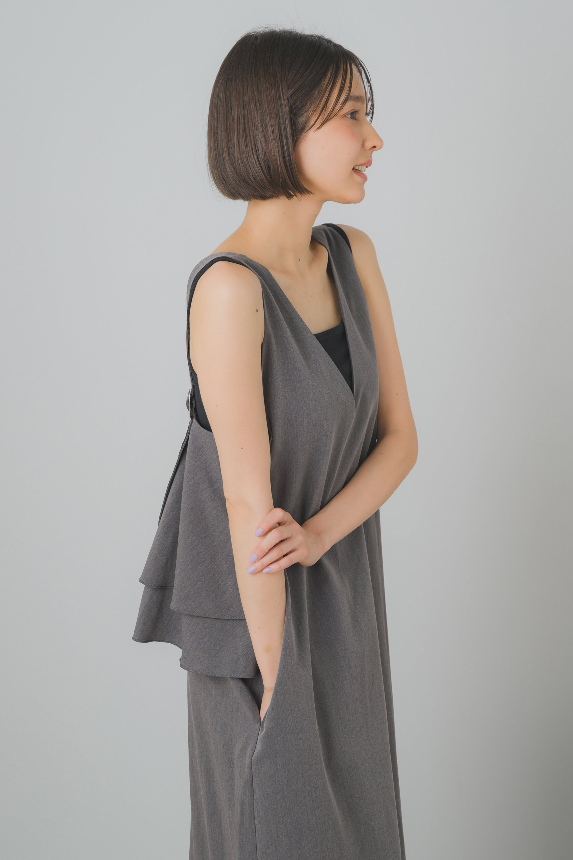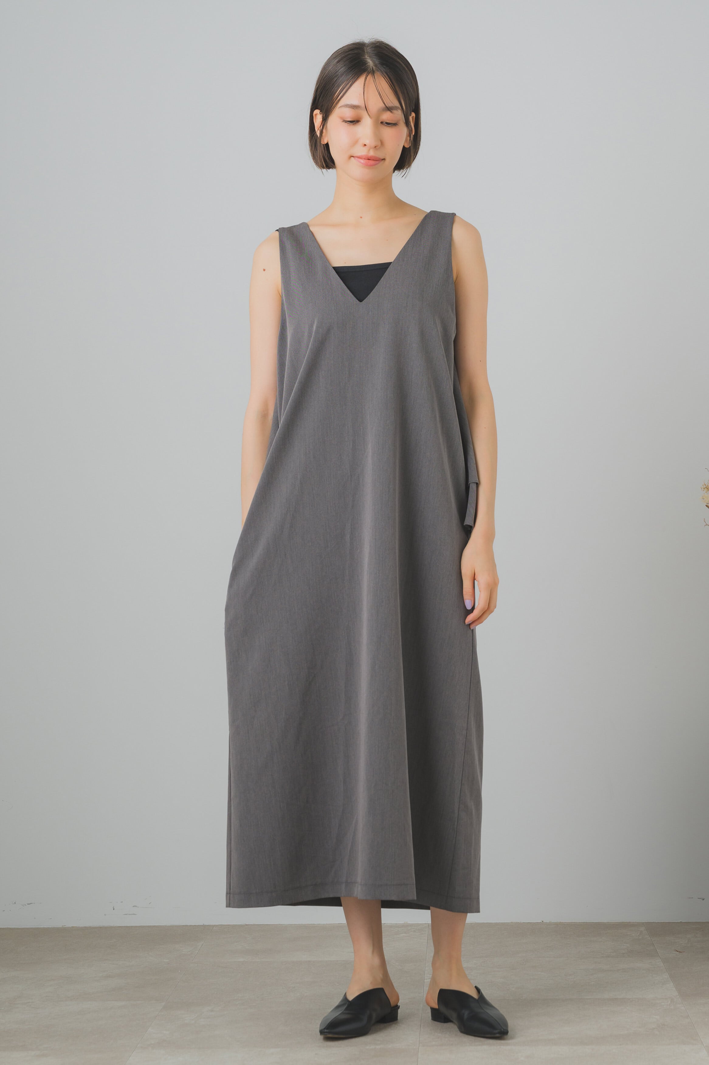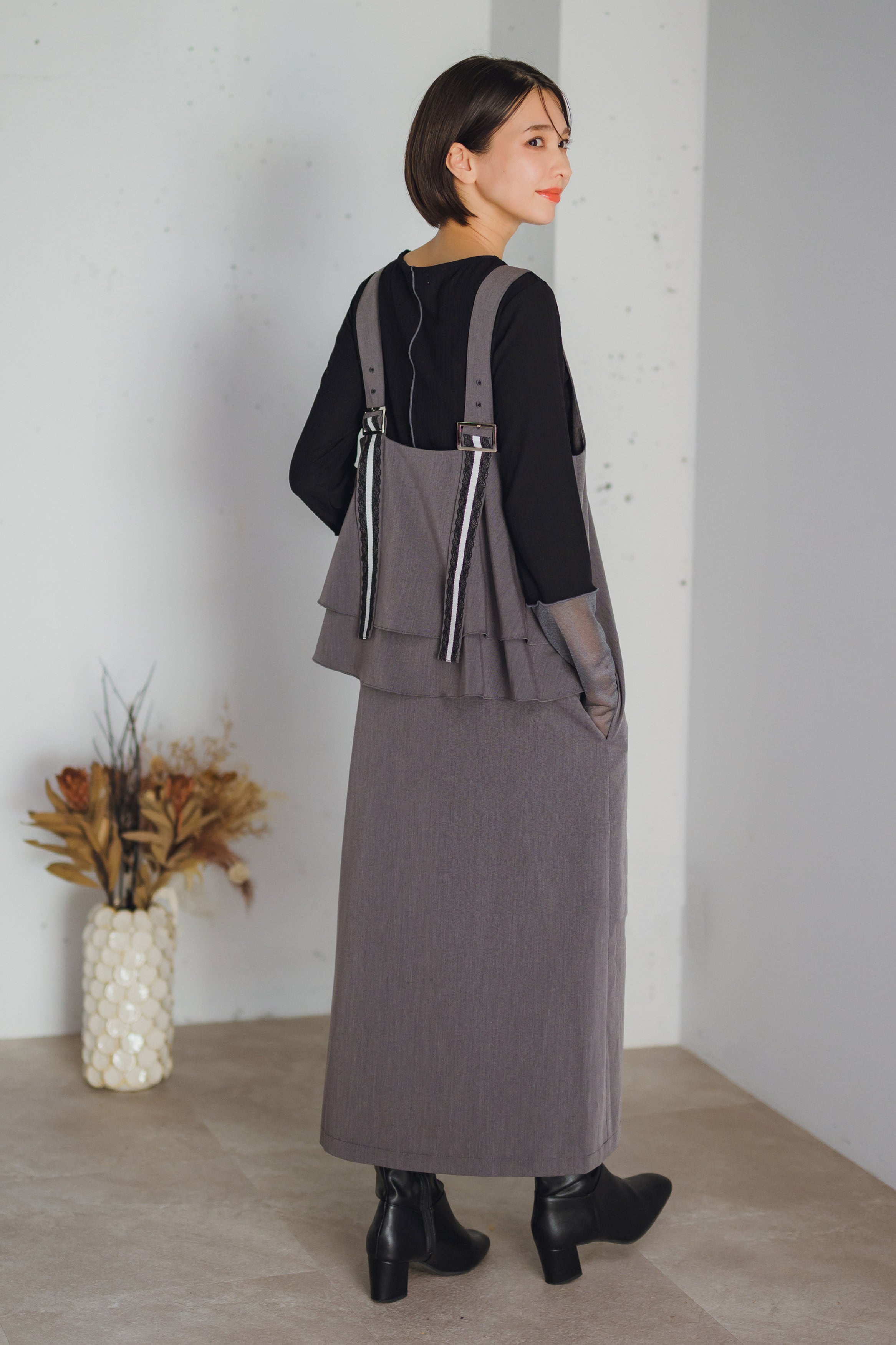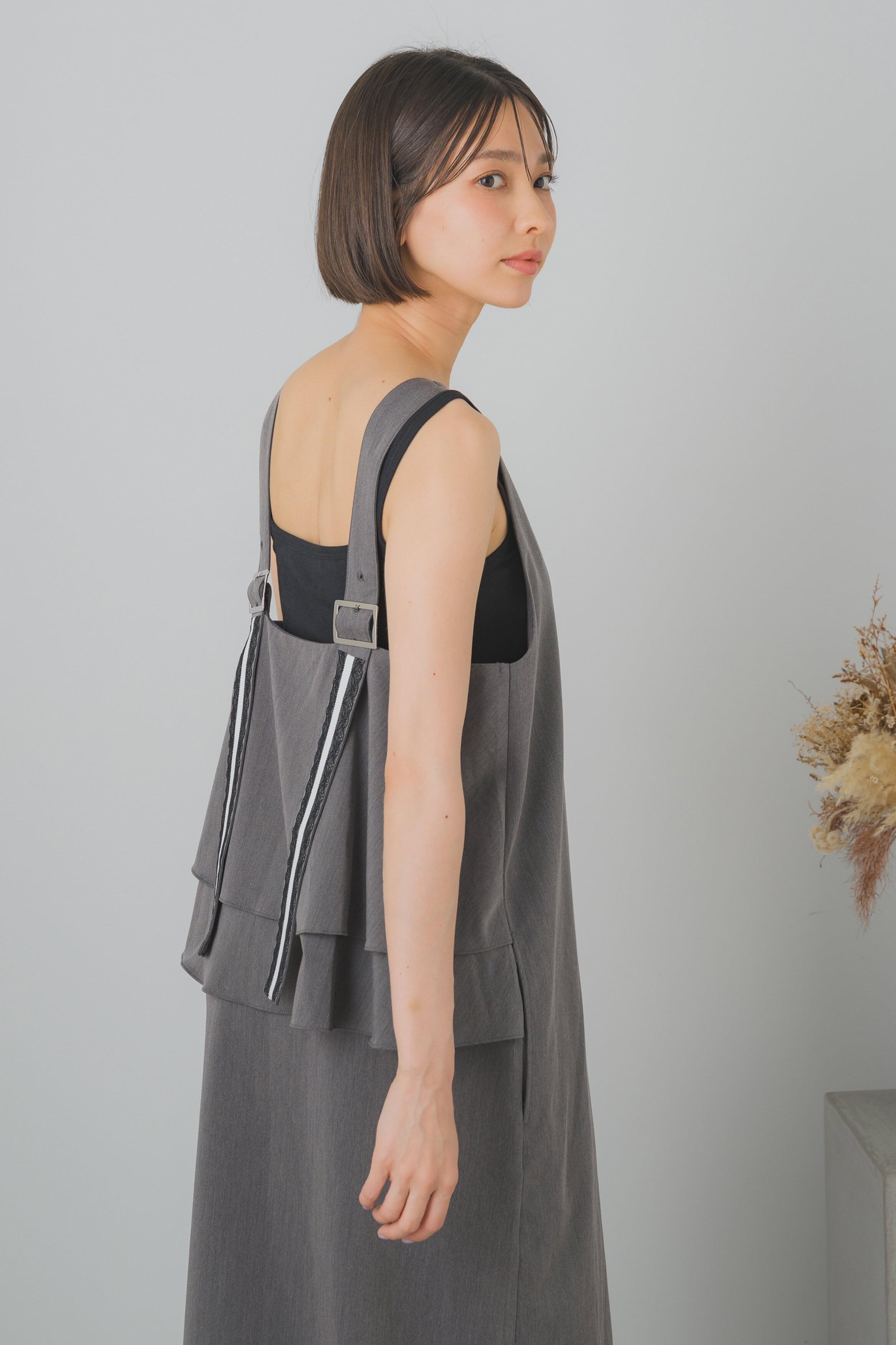 後ろ姿に視線を集める、フリルデザインのサスワンピース。