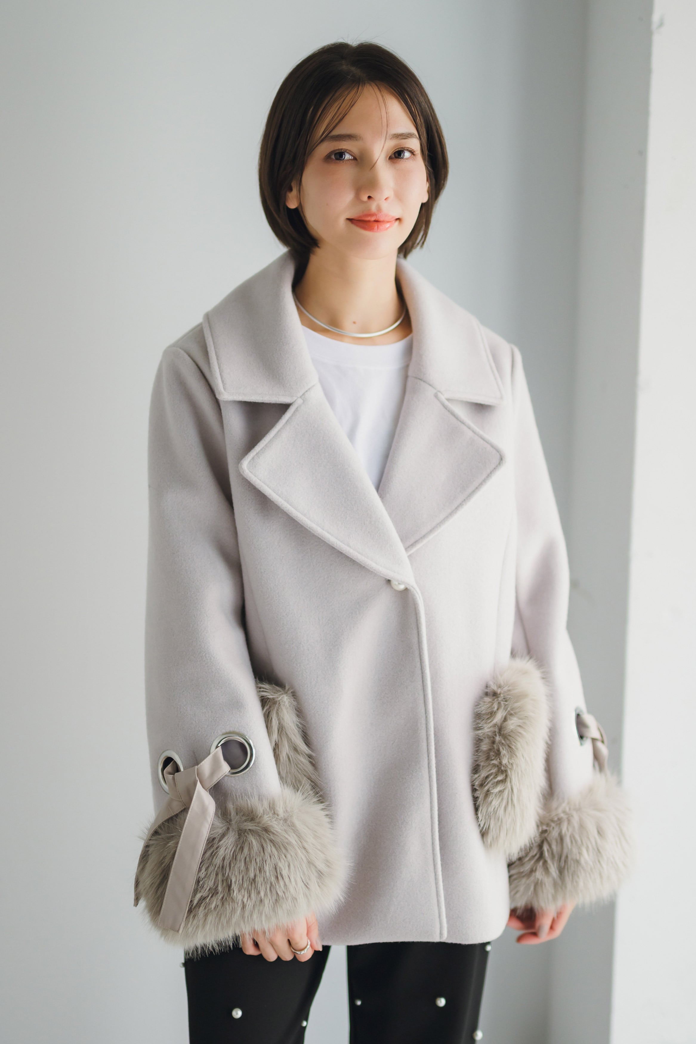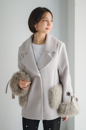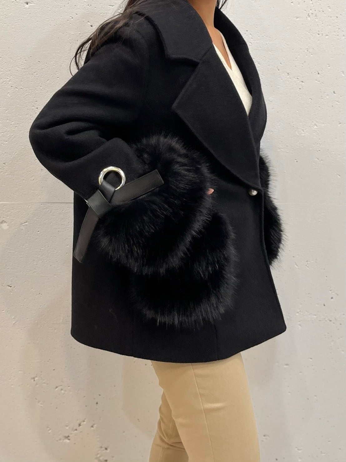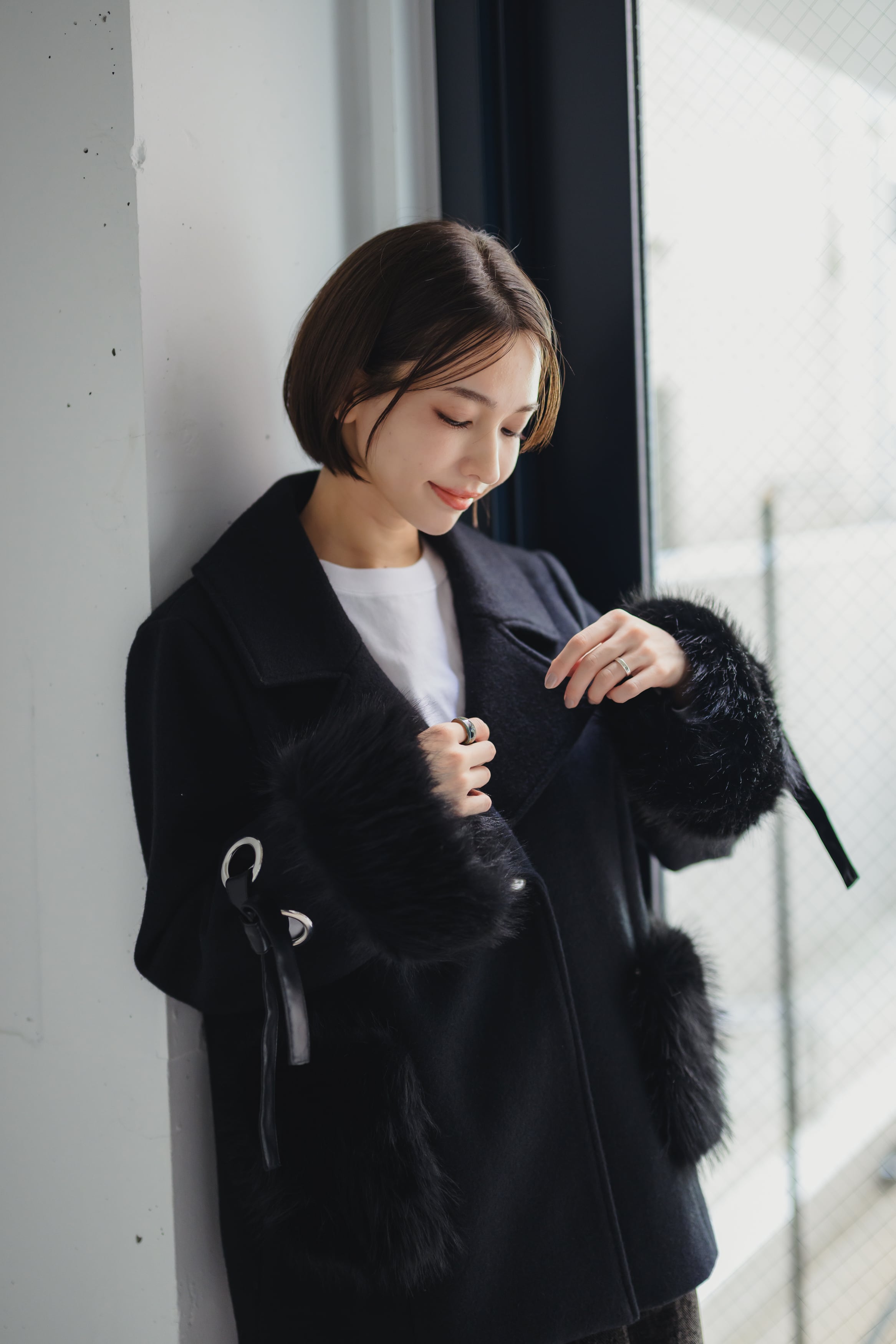 ふわふわのポケットファーと可愛らしい袖口リボンが