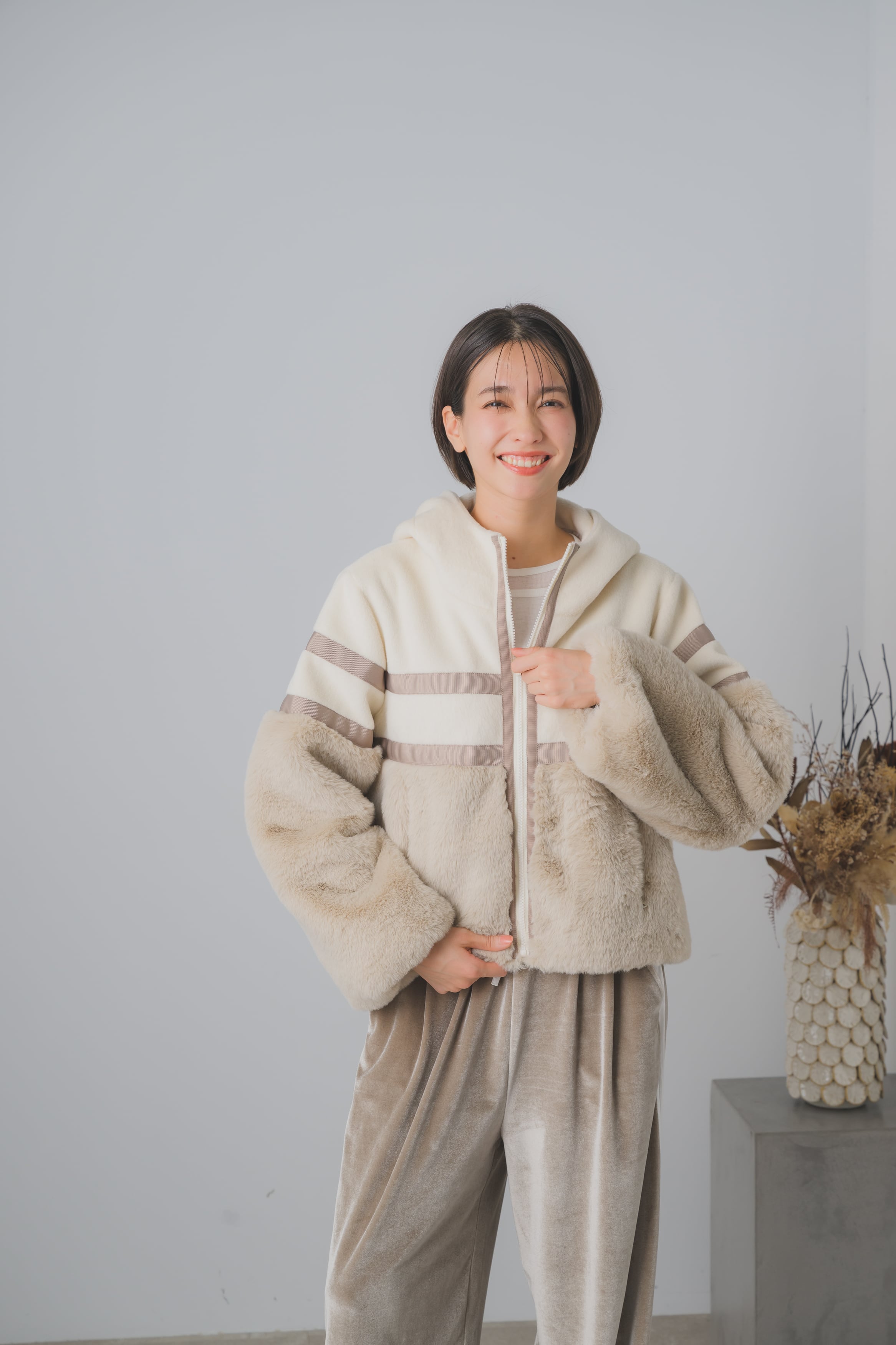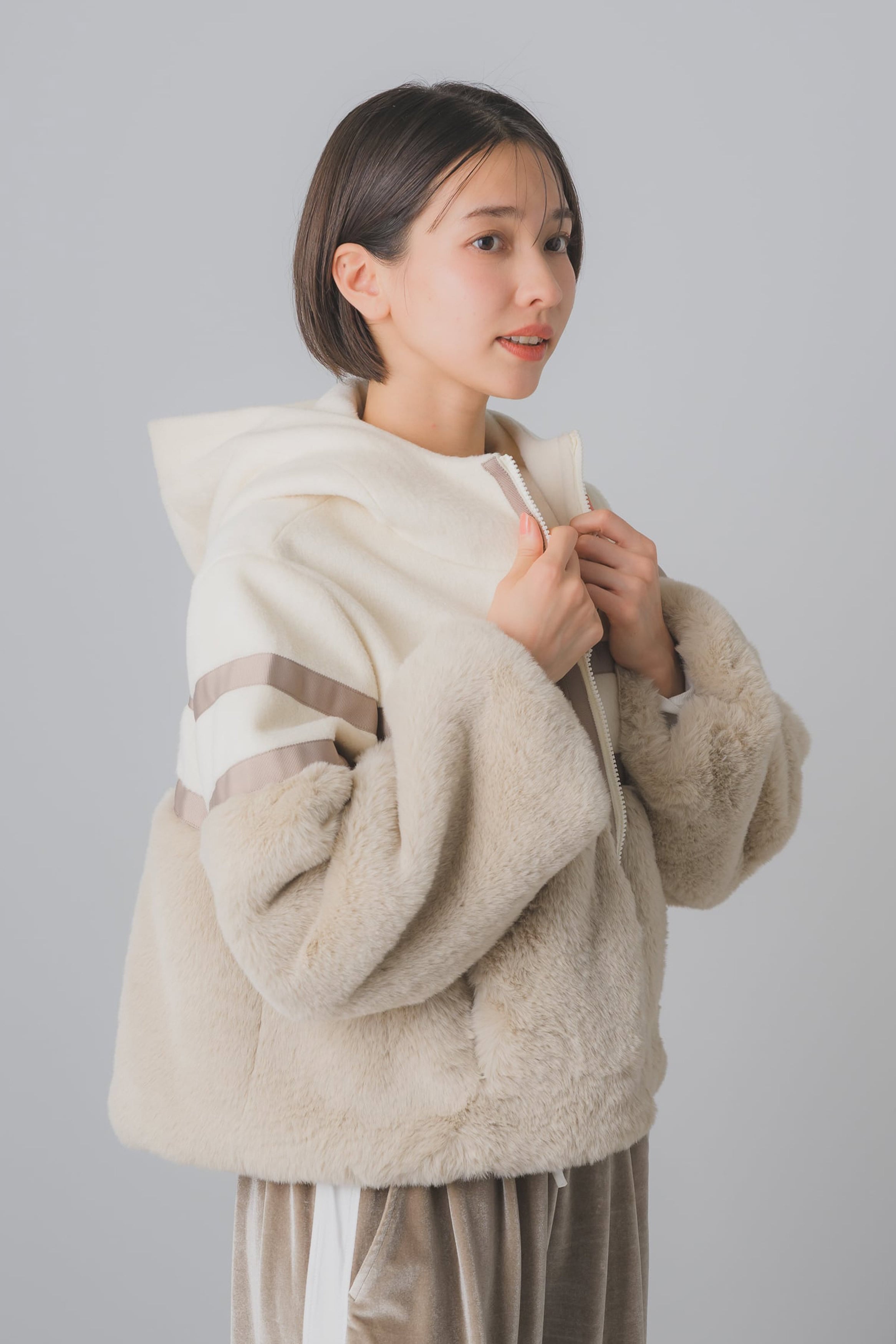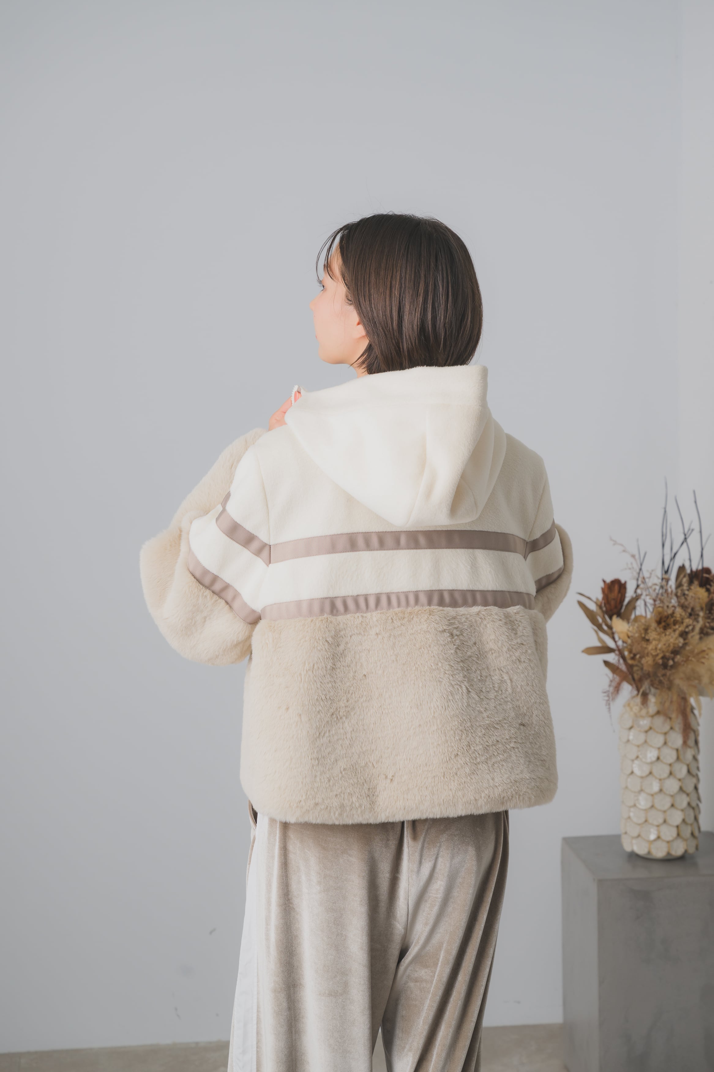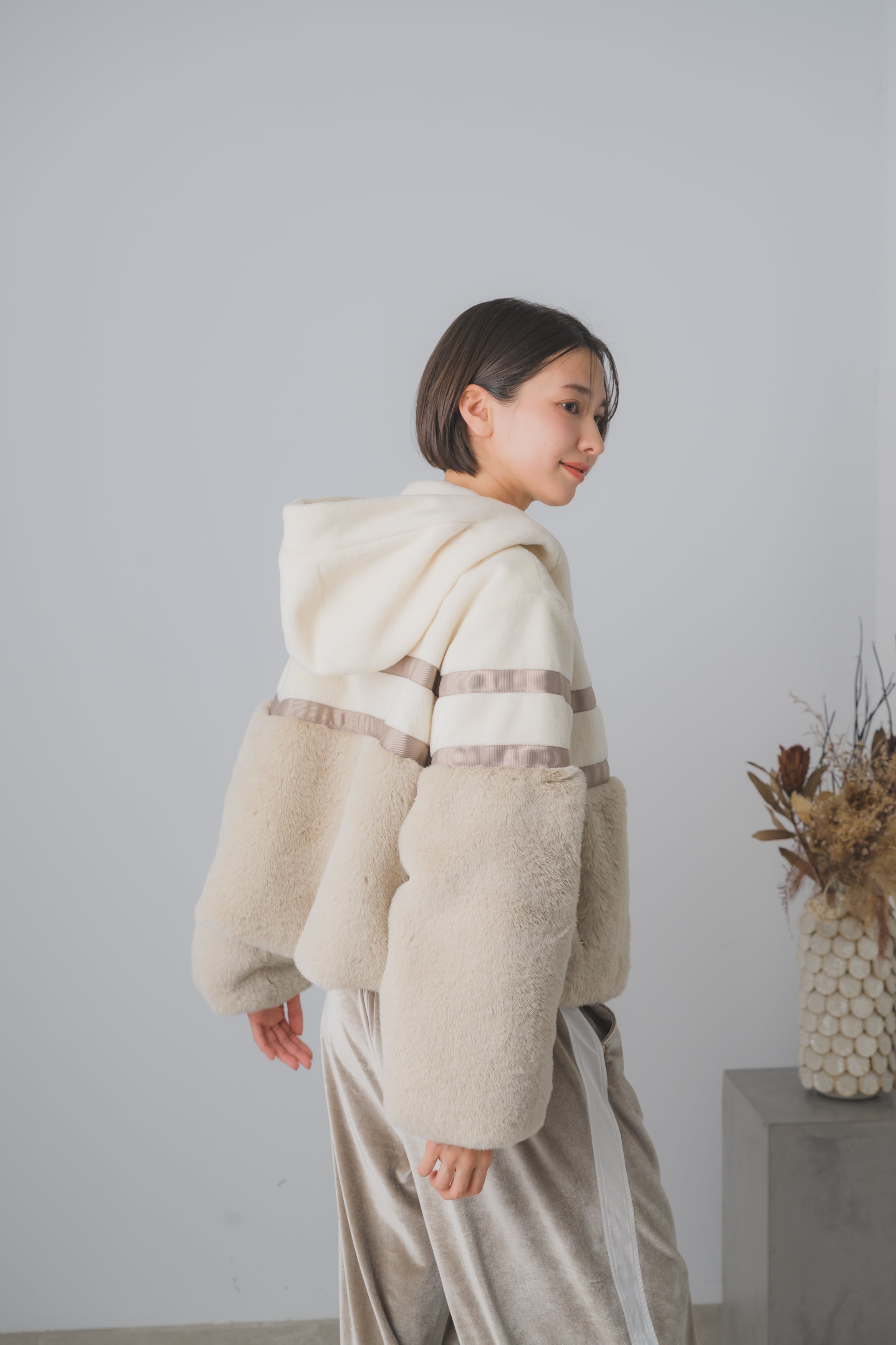 ボア素材で仕立てられた、冬の必需品です。
