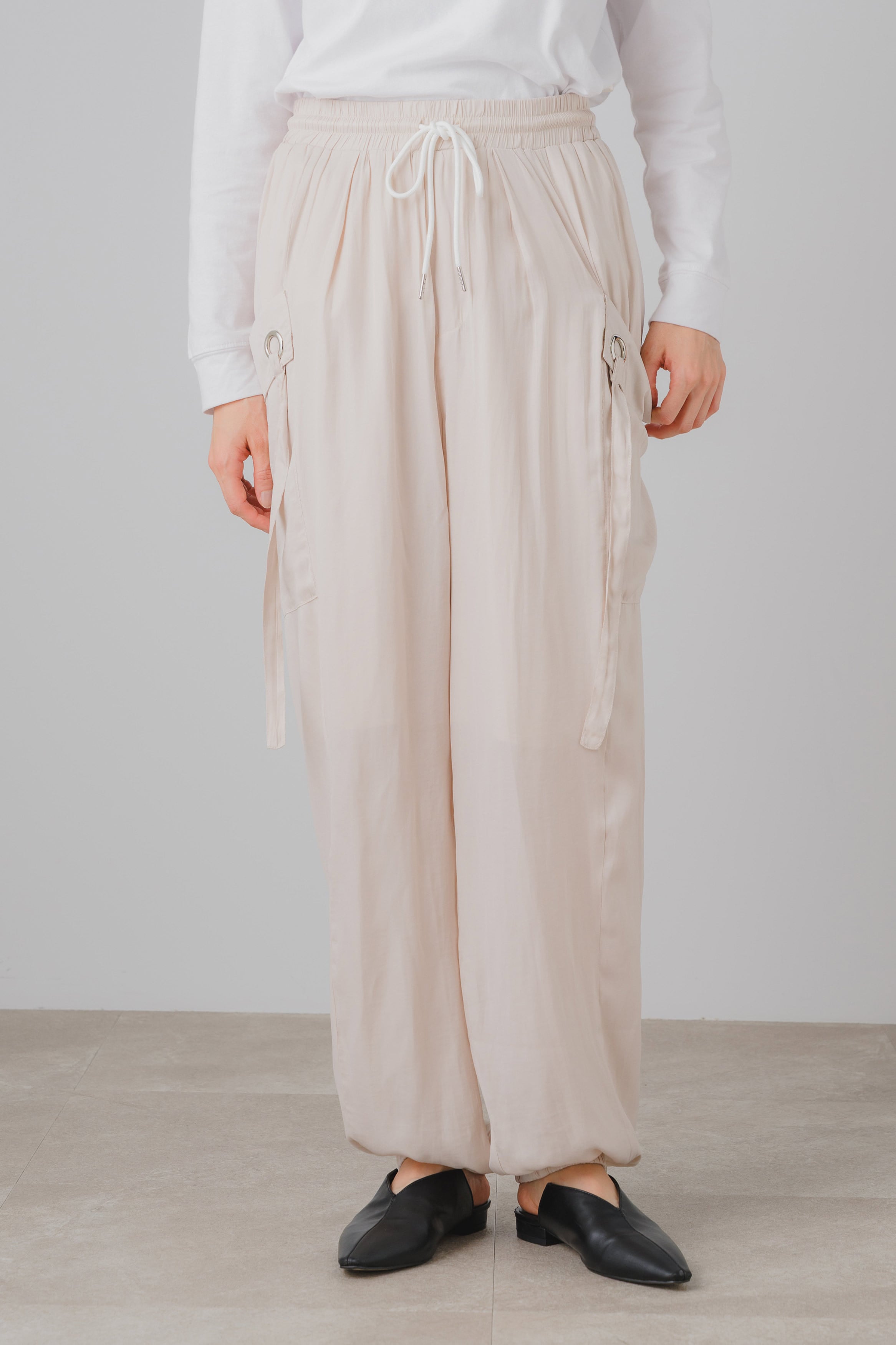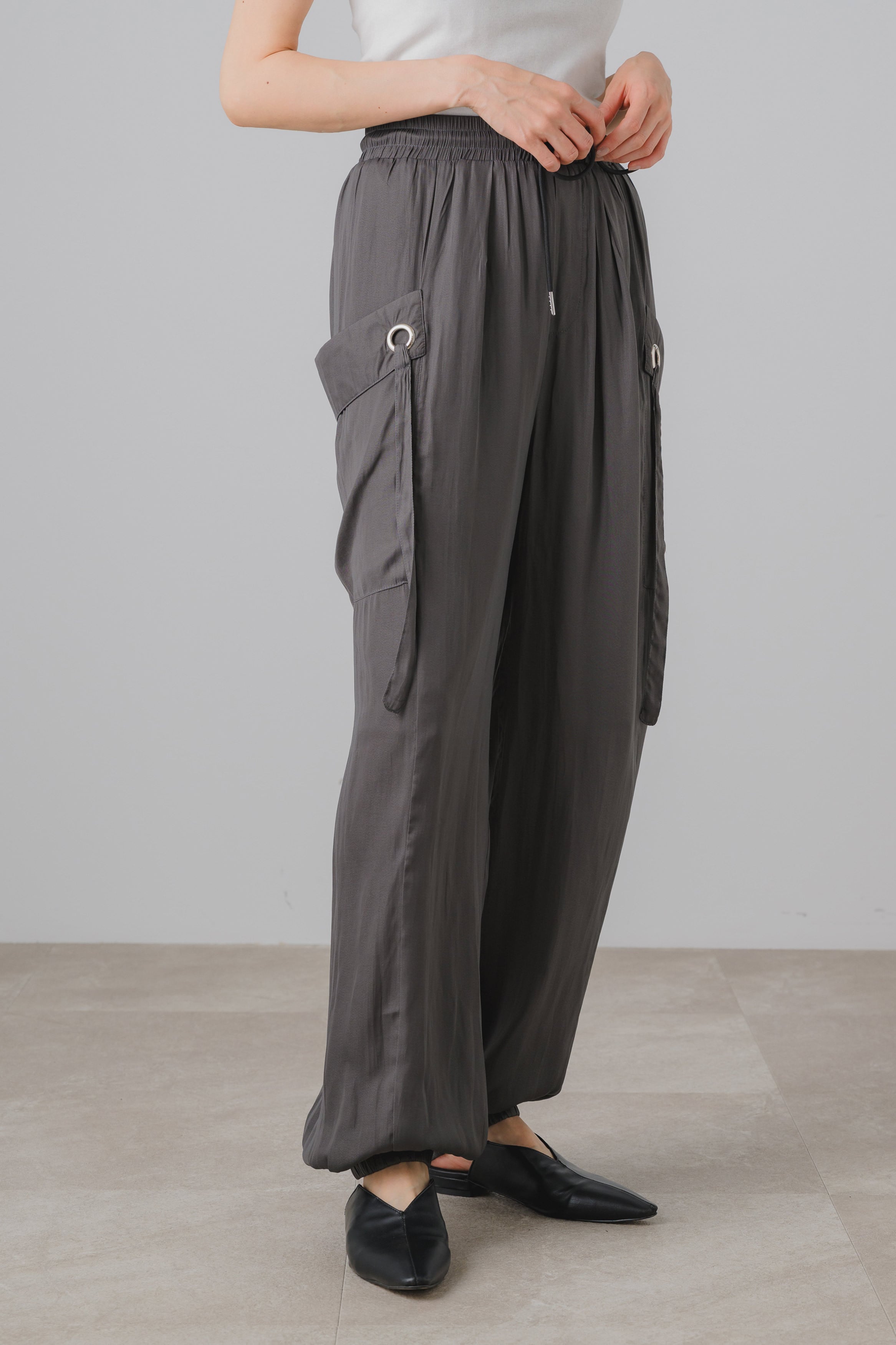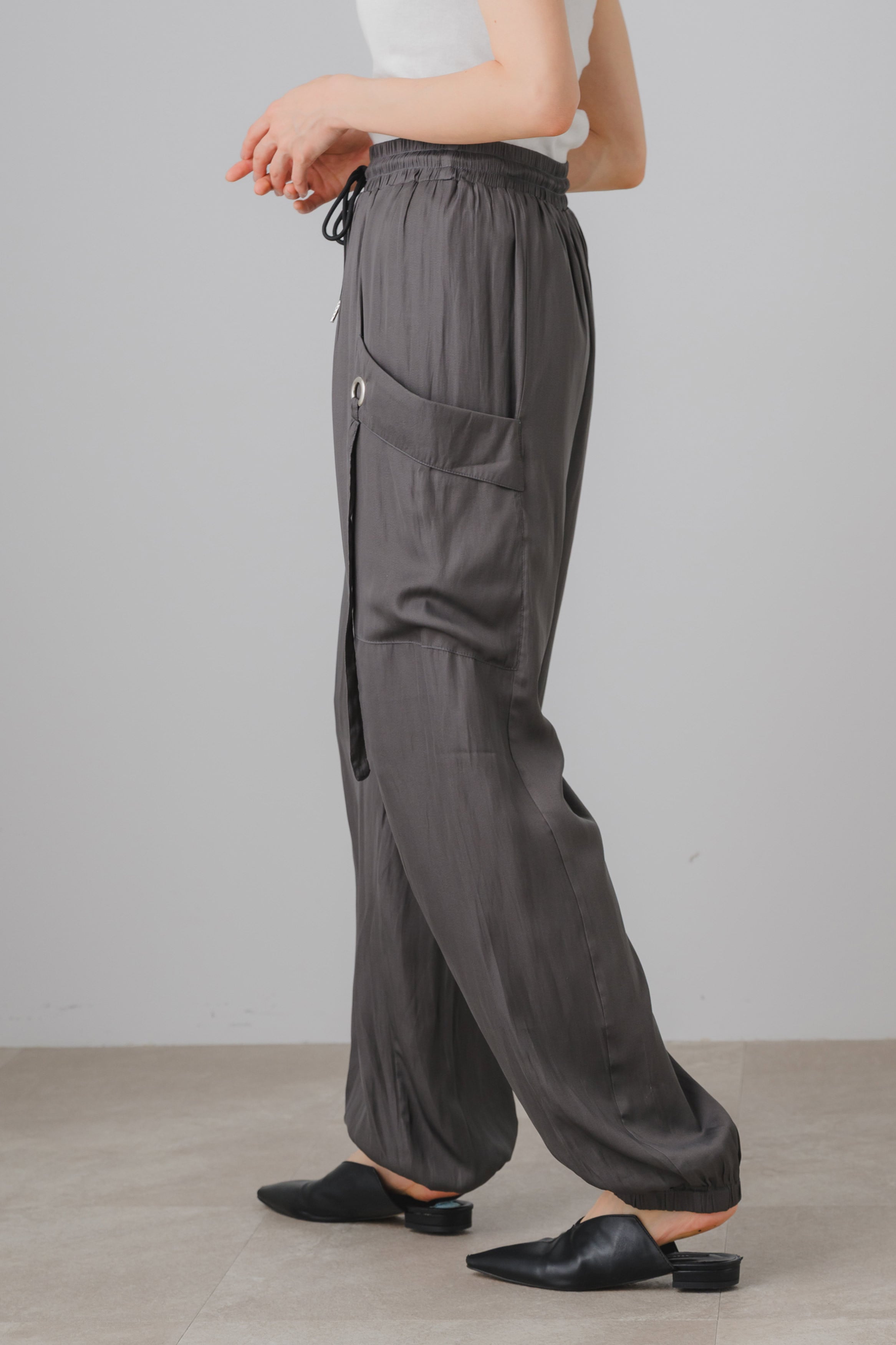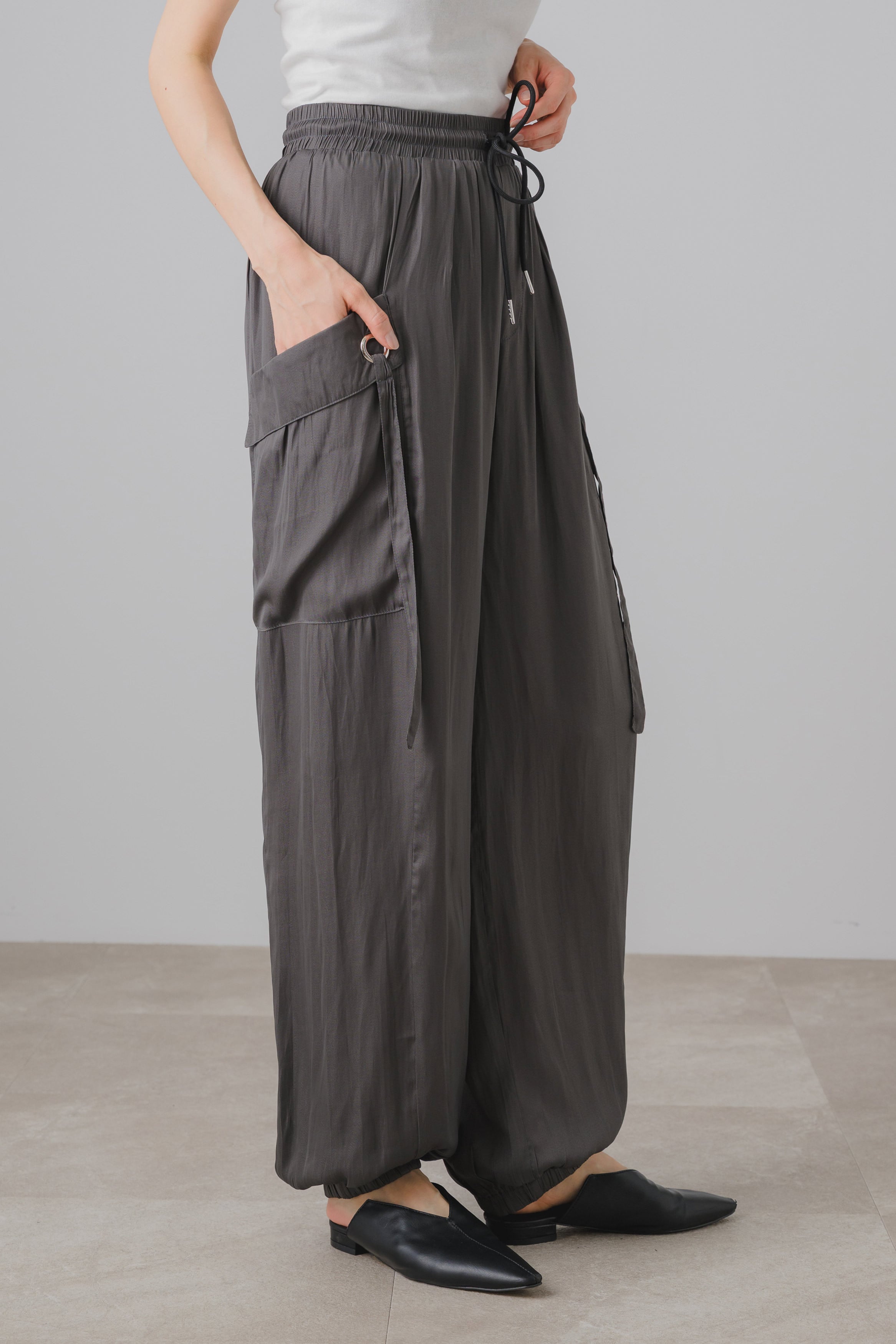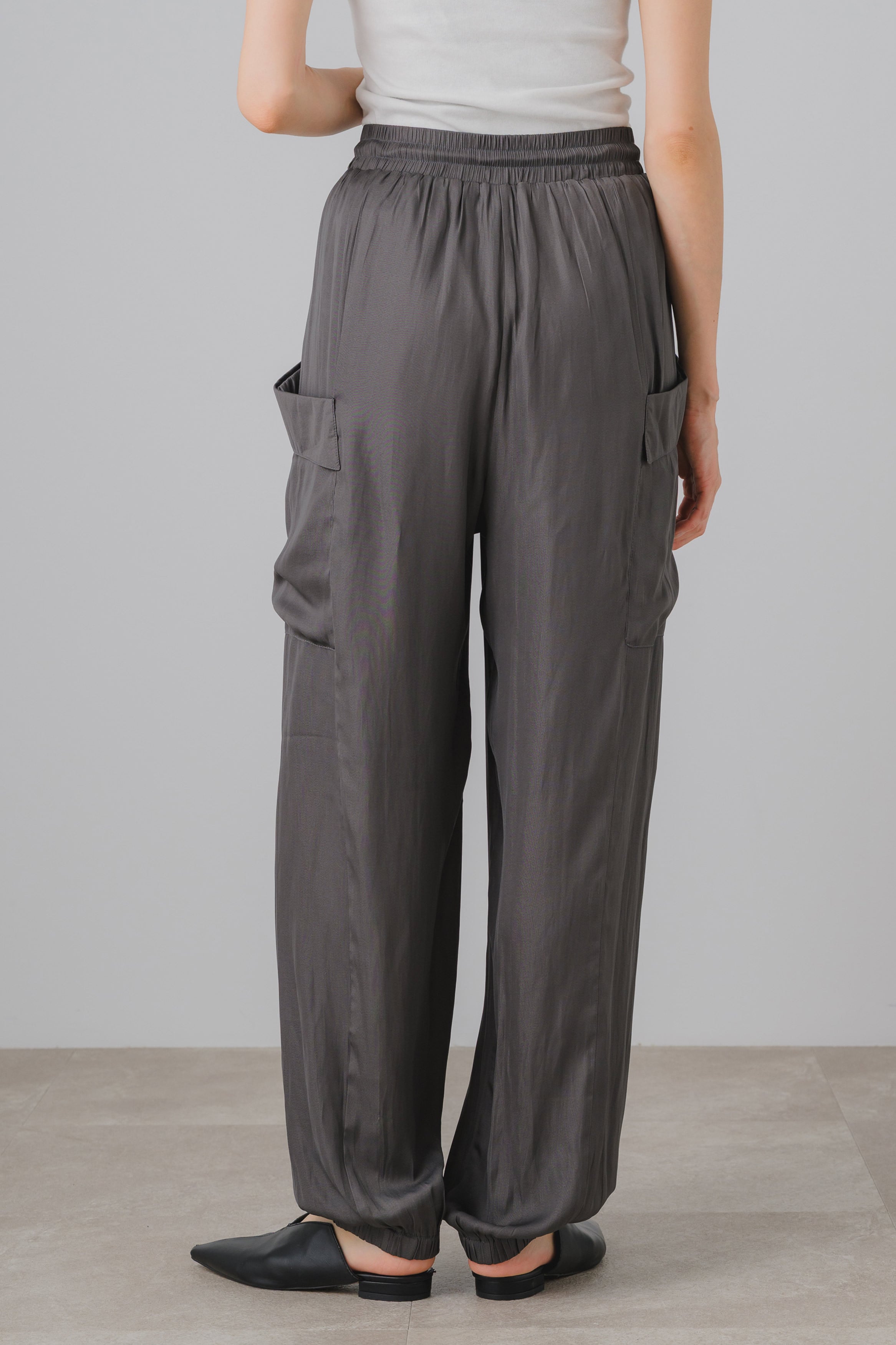 艶っとした素材感が特徴のサテンカーゴパンツ。