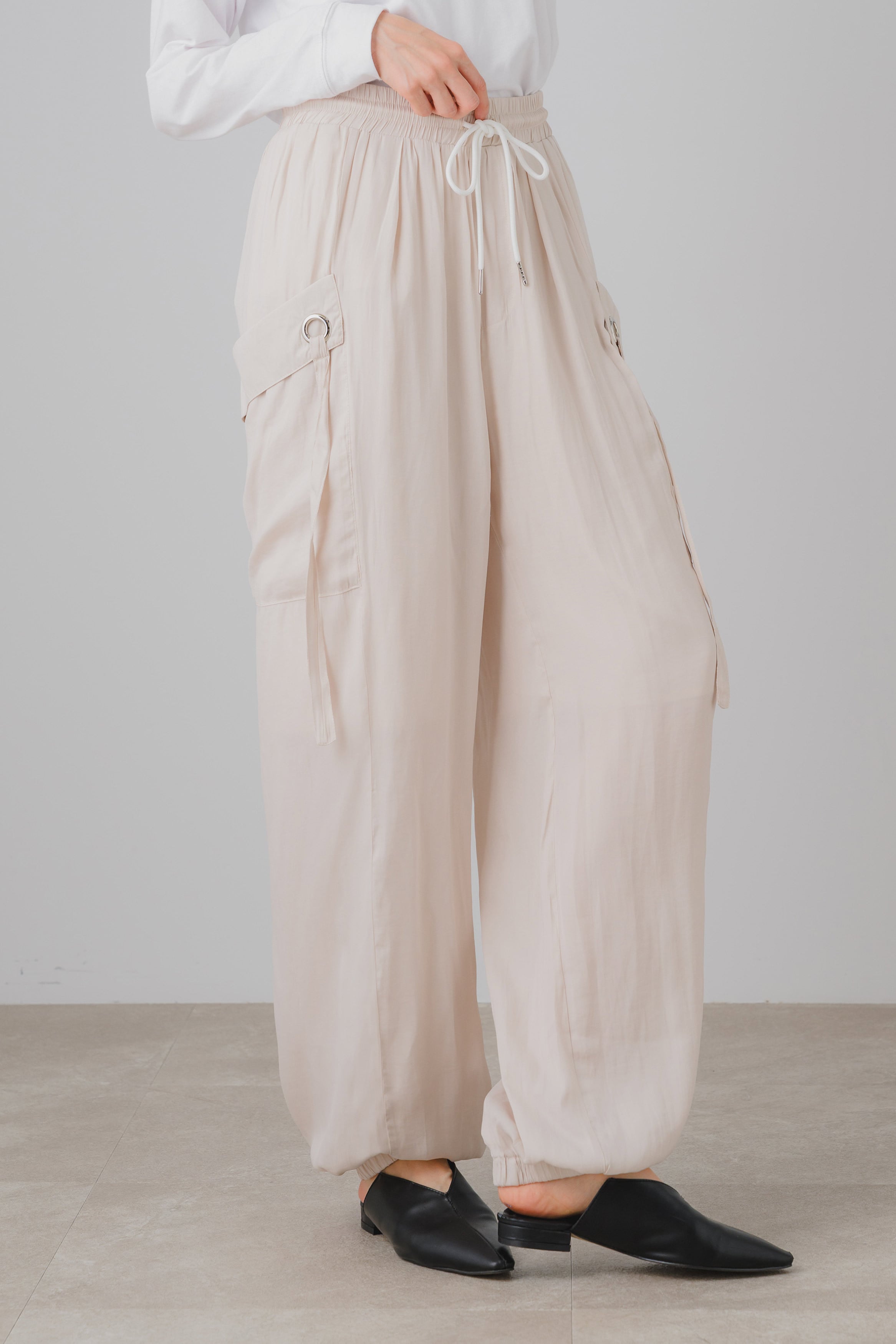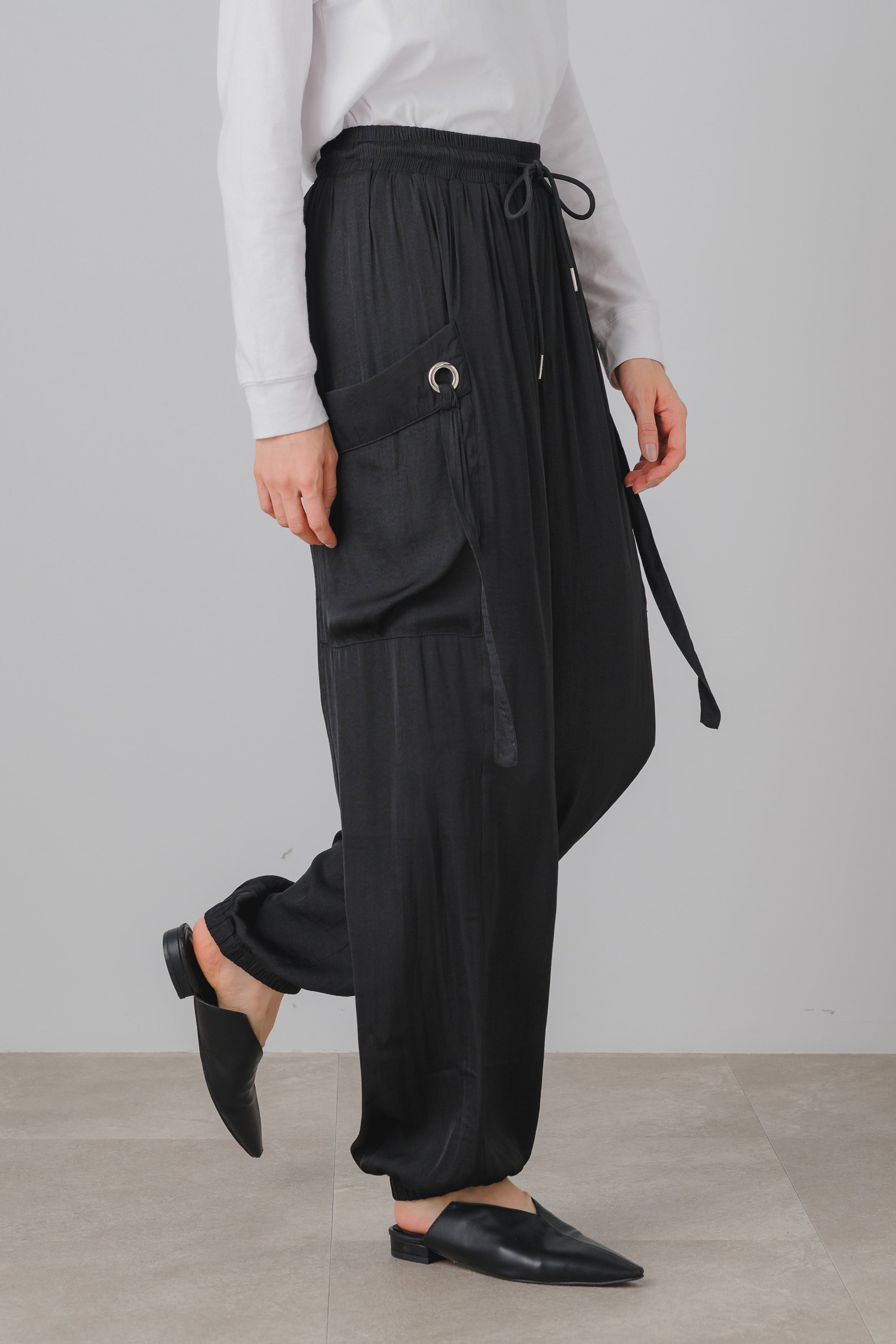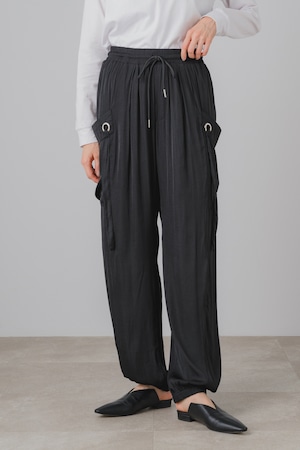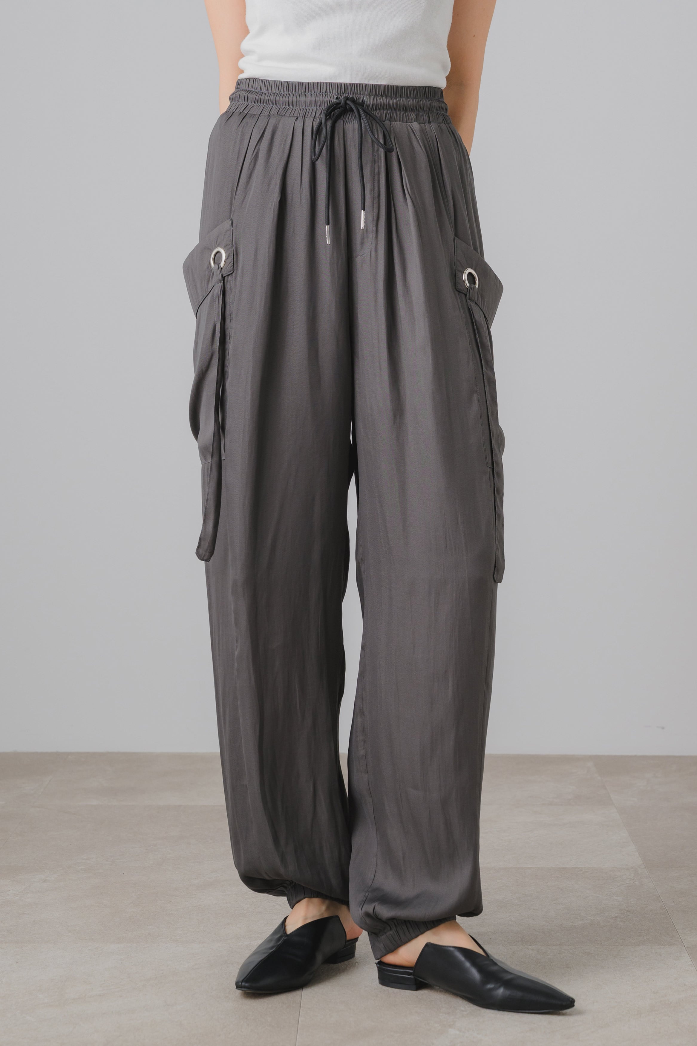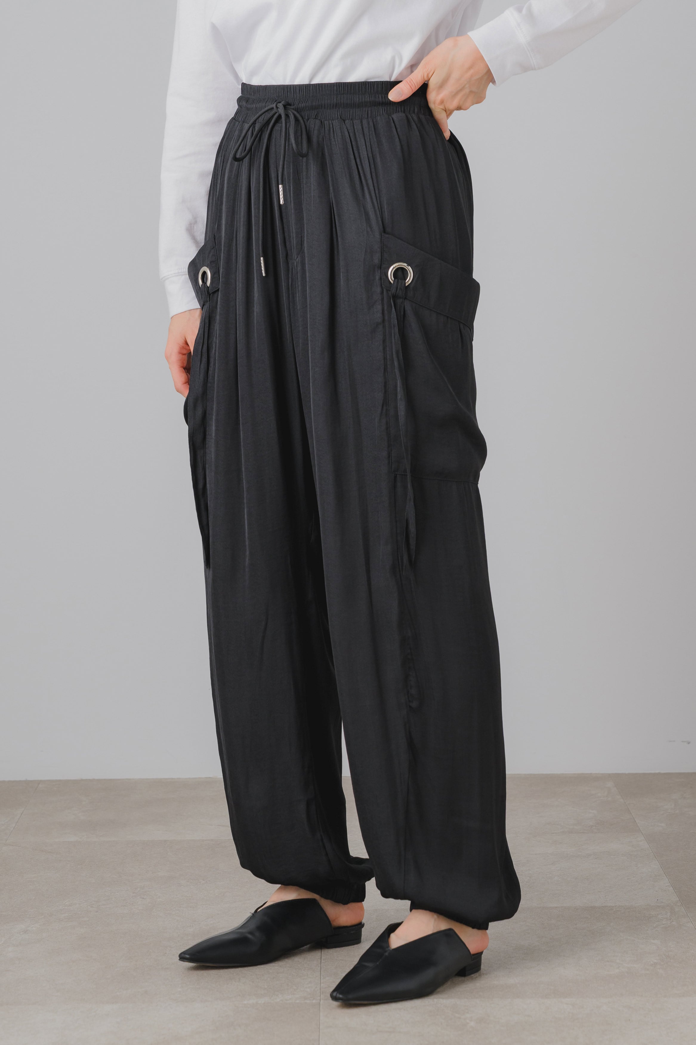 艶っとした素材感が特徴のサテンカーゴパンツ。