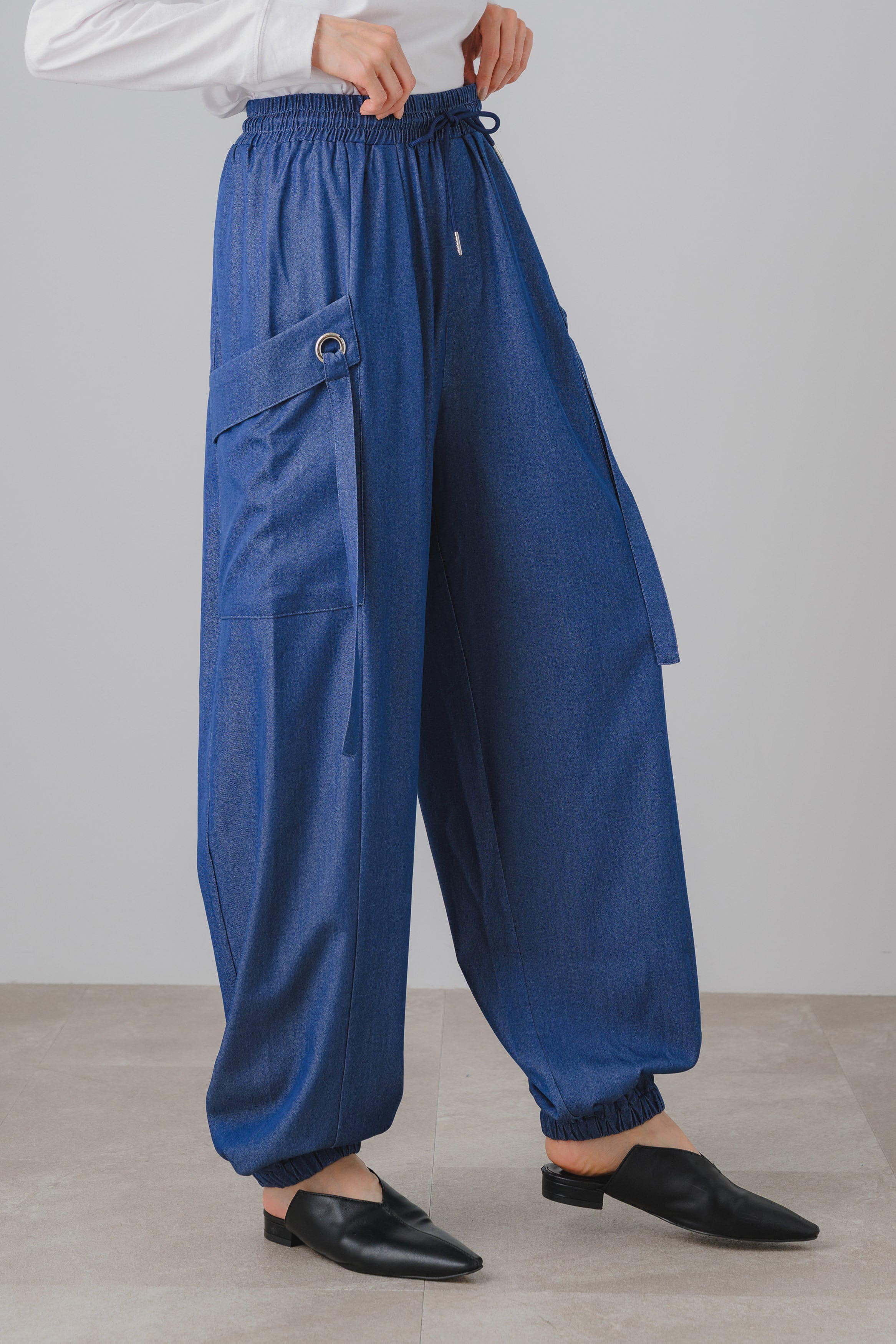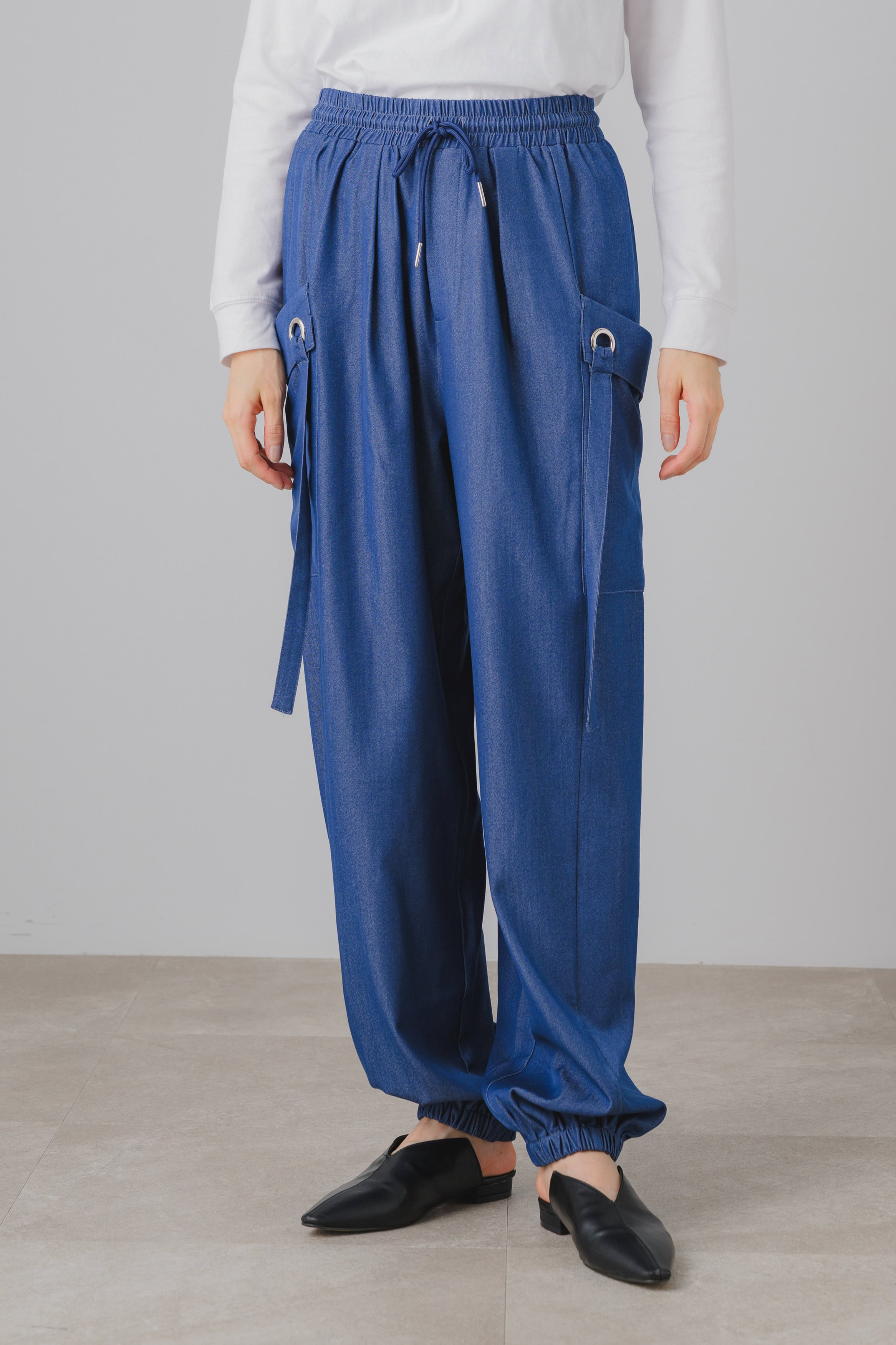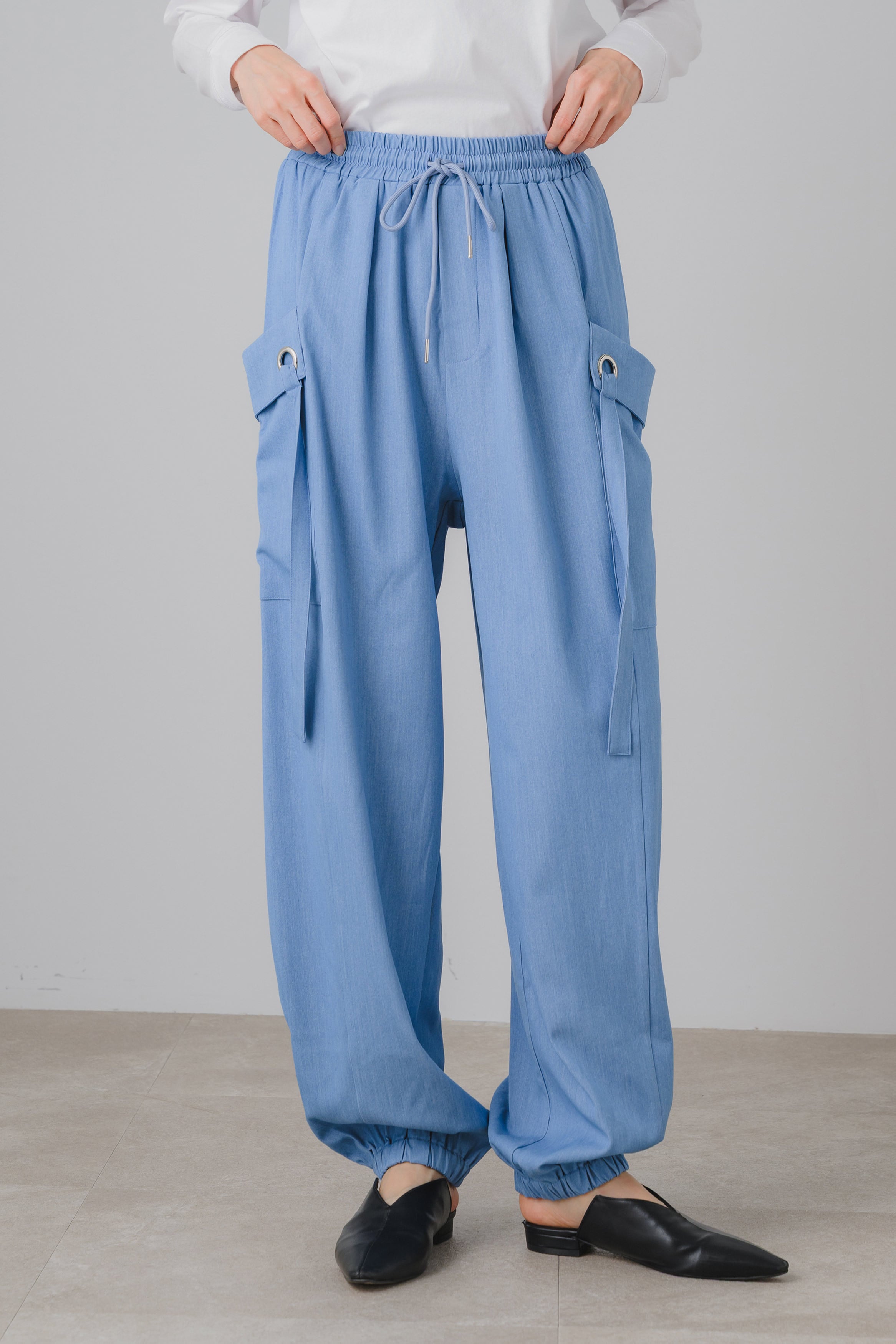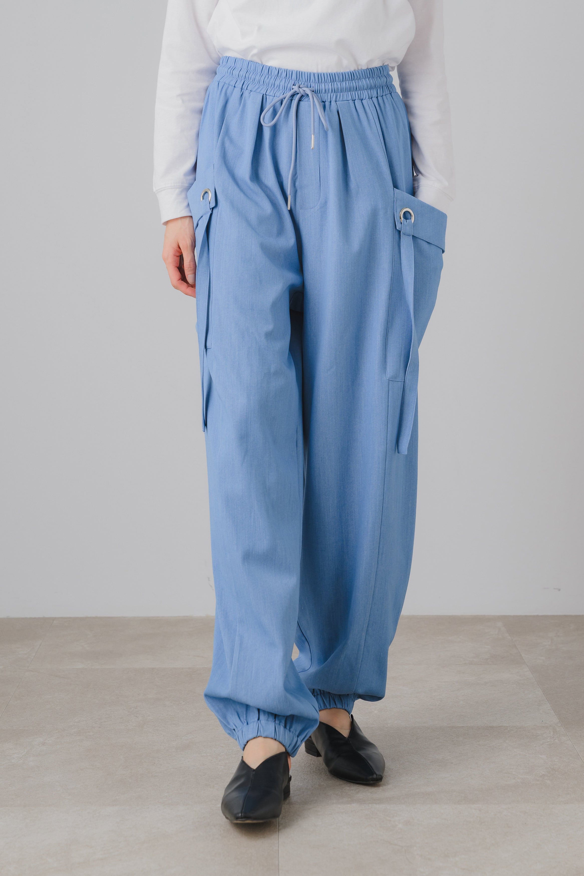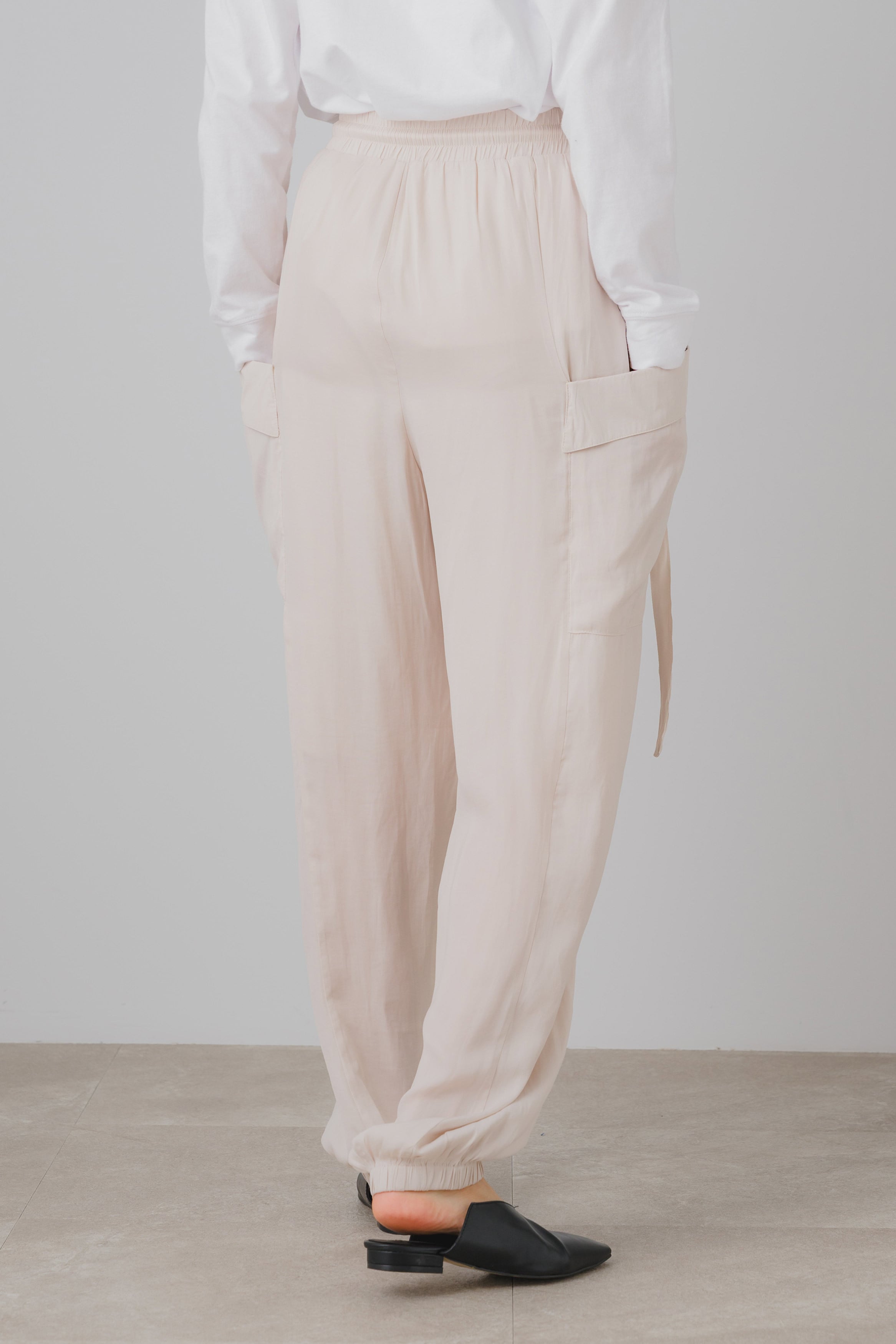 艶っとした素材感が特徴のサテンカーゴパンツ。