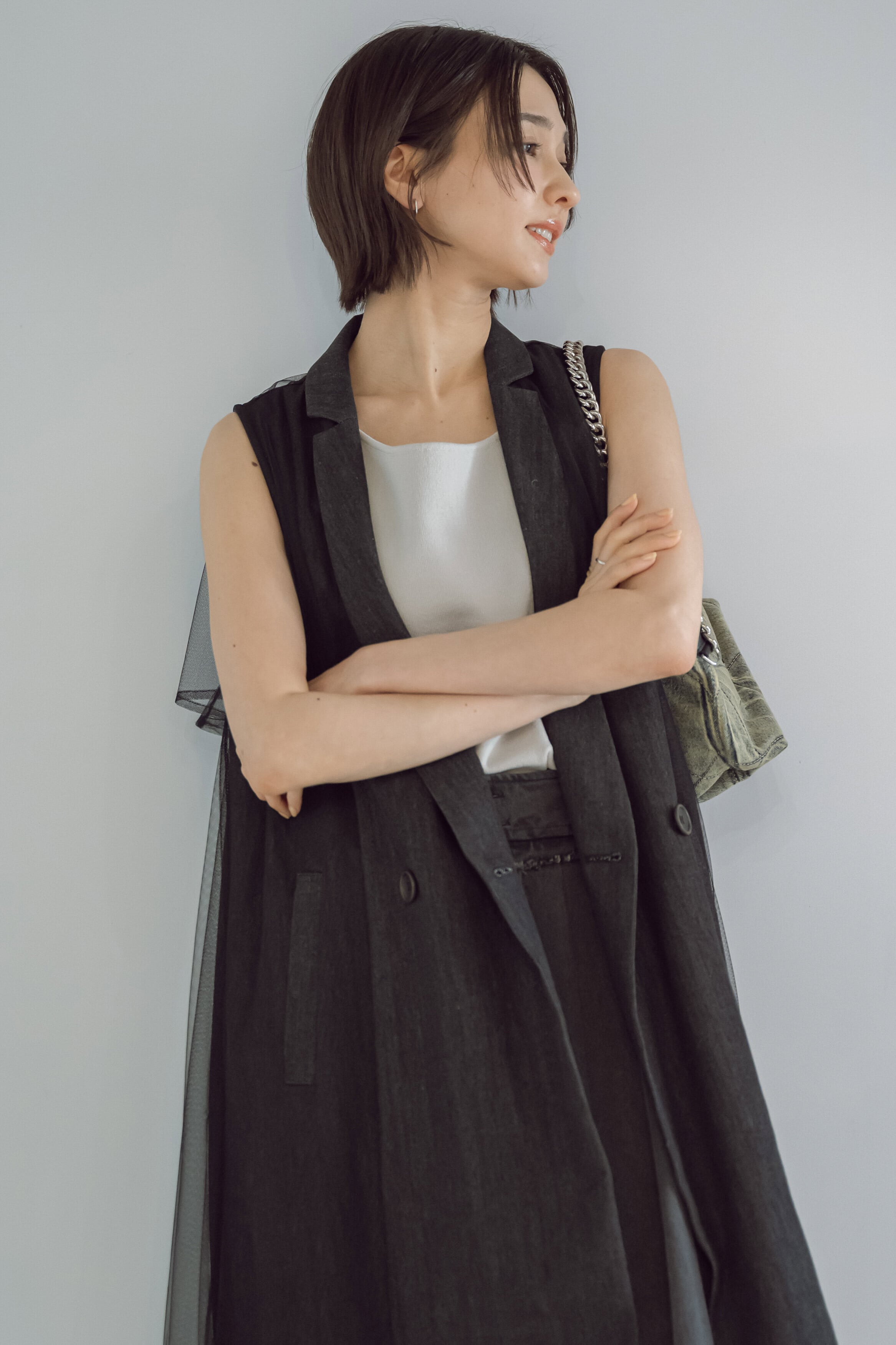 トレンド感あふれるチュールレイヤードデニムジレ。