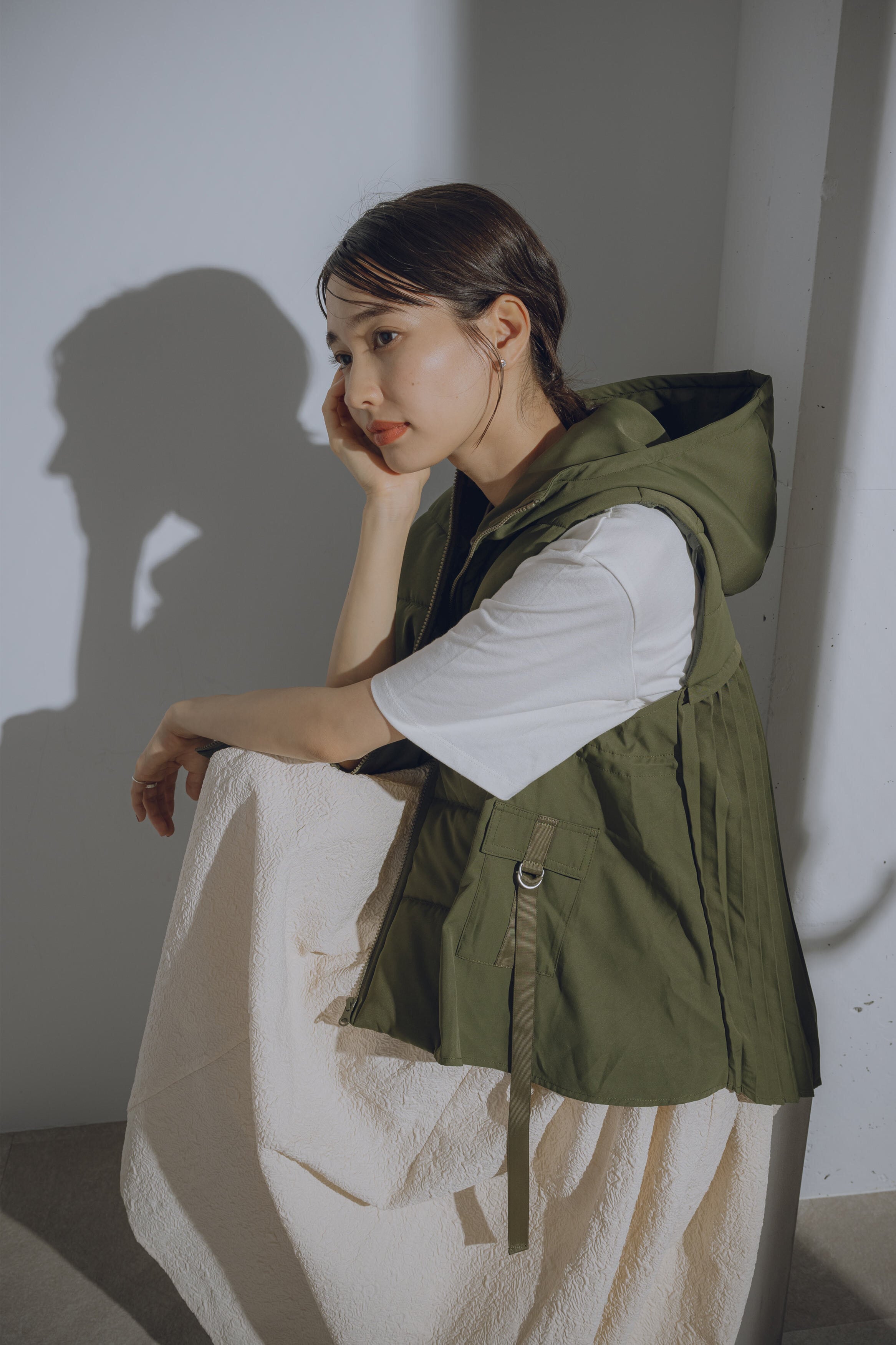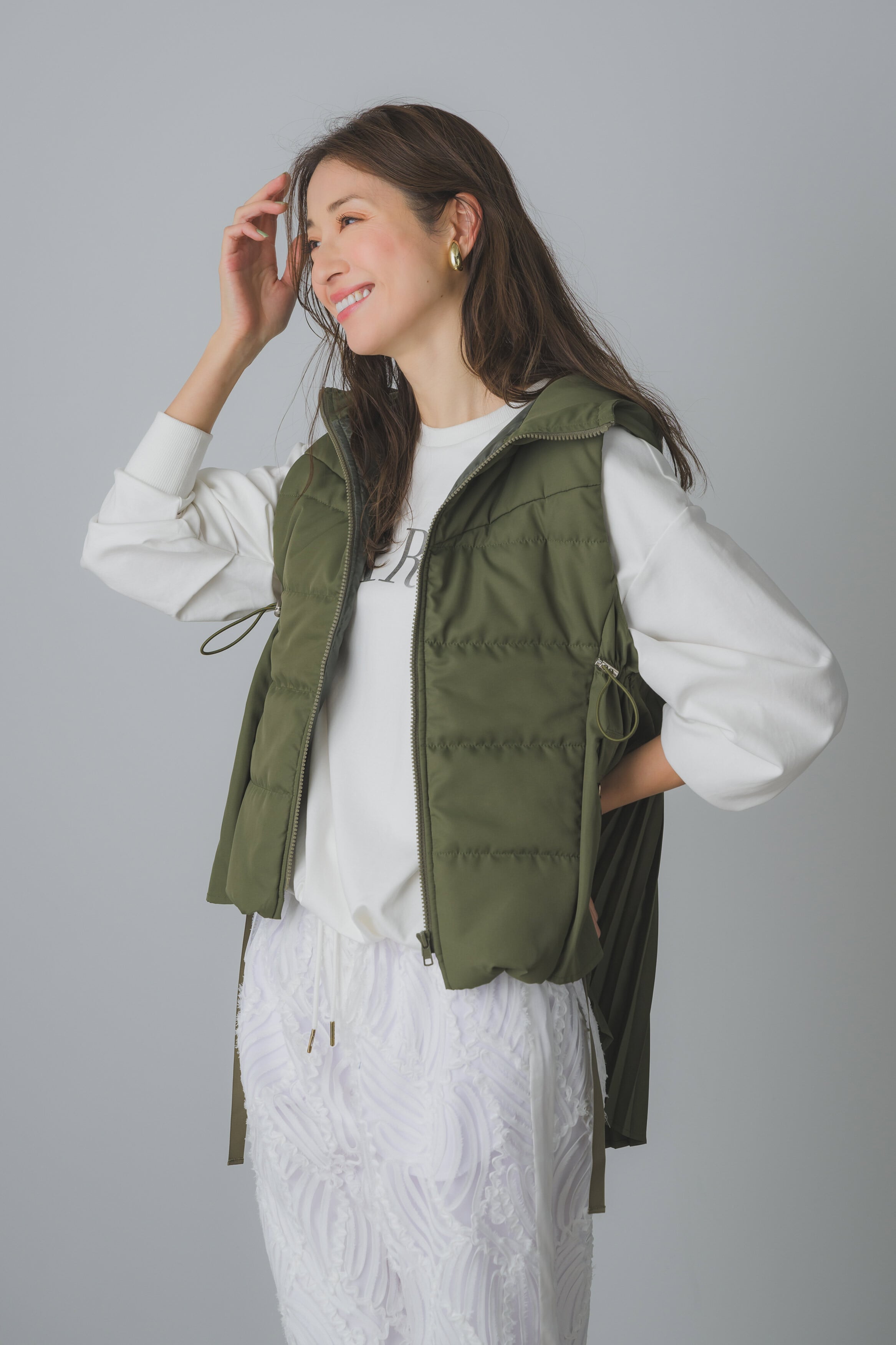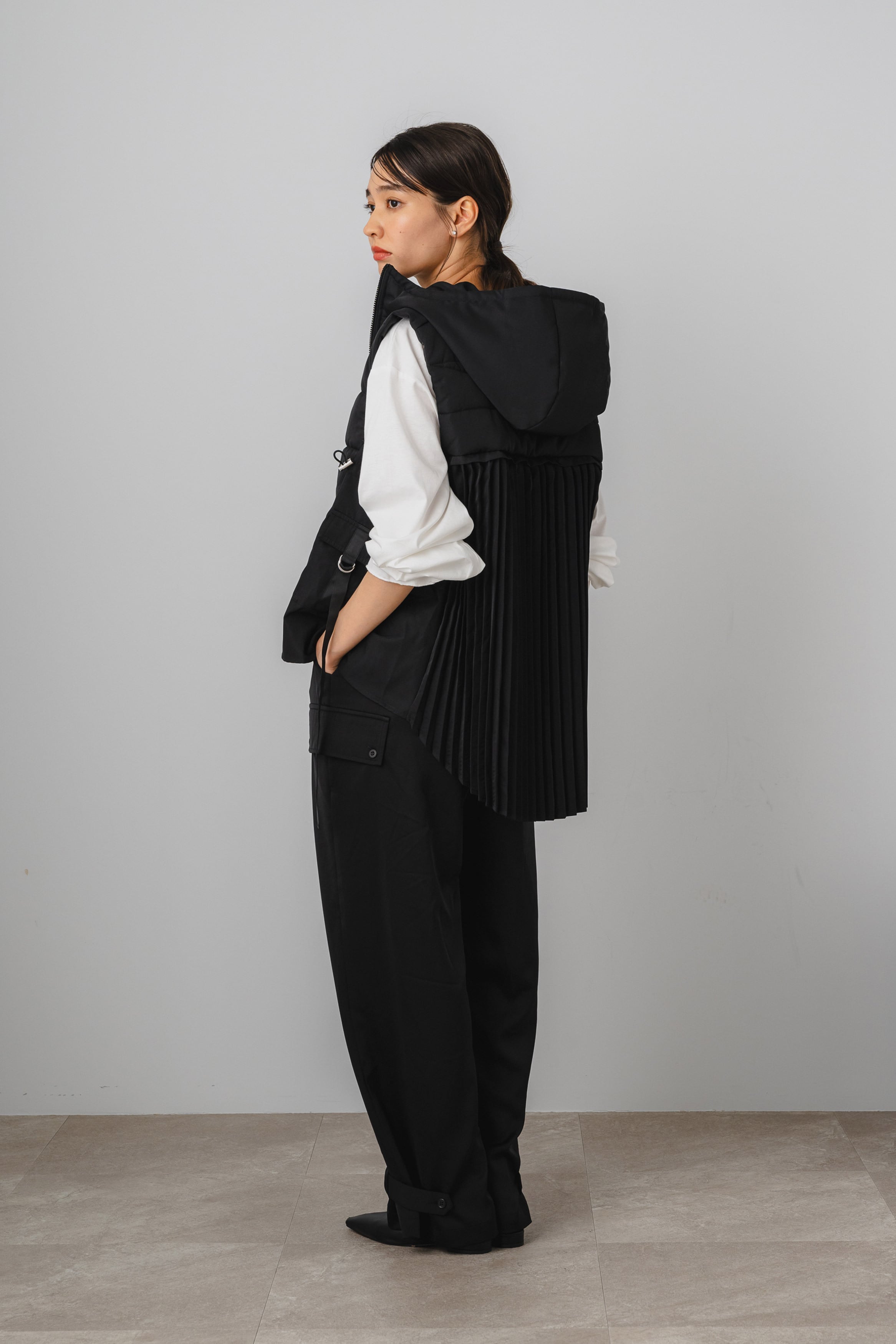 バックプリーツが加わったスタイリッシュな中綿ベスト。